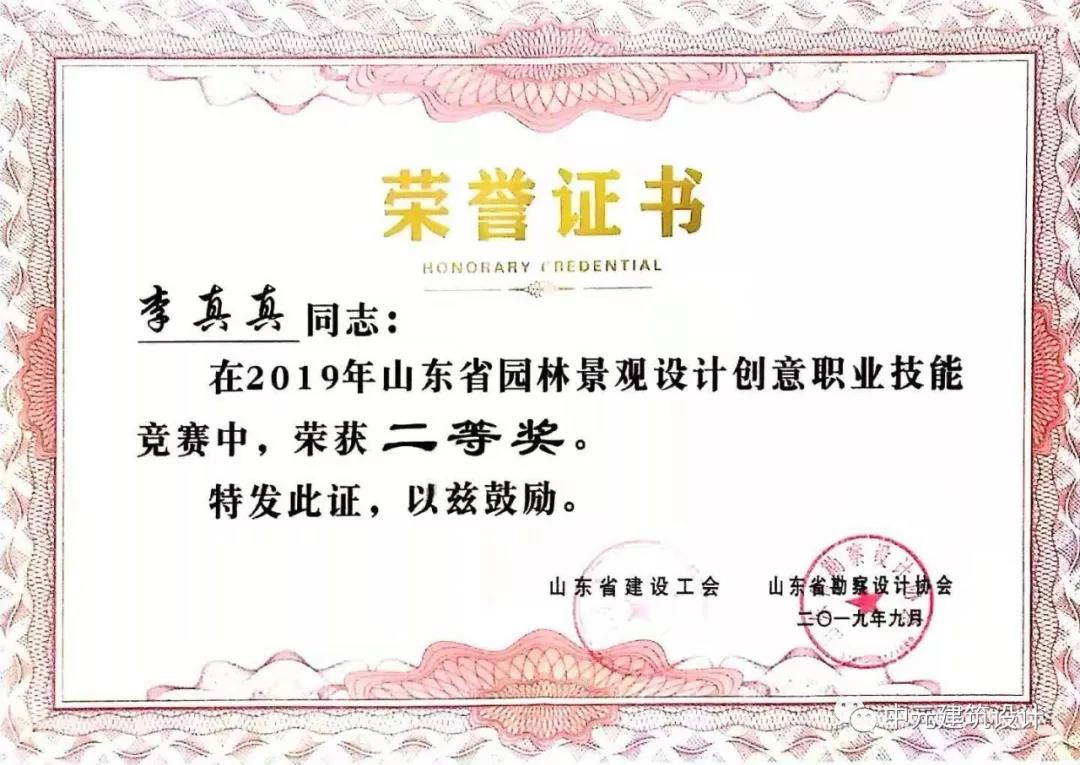 祝賀我公司李真真在2019年度山東省園林景觀(guān)設計創(chuàng )意職業(yè)技能競賽中獲得全省二等獎的驕人戰績(jì)。為公司和個(gè)人贏(yíng)得榮譽(yù)。