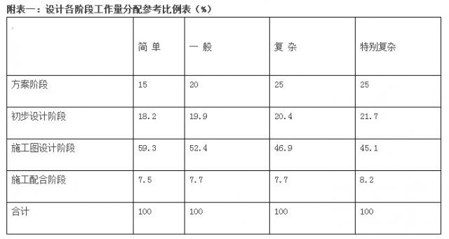 定額》(住房和城鄉建設部頒發(fā)),詳見(jiàn)附表一《設計各階段工作量分配參考比例表》。