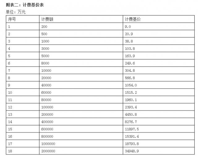 注:計費基價(jià)詳見(jiàn)附表二《計費基價(jià)表》,計費額處于兩個(gè)數值區間的,采用內插法確定設計計費基價(jià);工程復雜程度調整系數詳見(jiàn)附表三《工程復雜程度調整系數表》