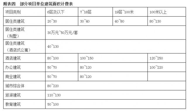 部分項目可采用單位建筑面積方式計費,詳見(jiàn)附表四《部分項目單位建筑面積計費表》