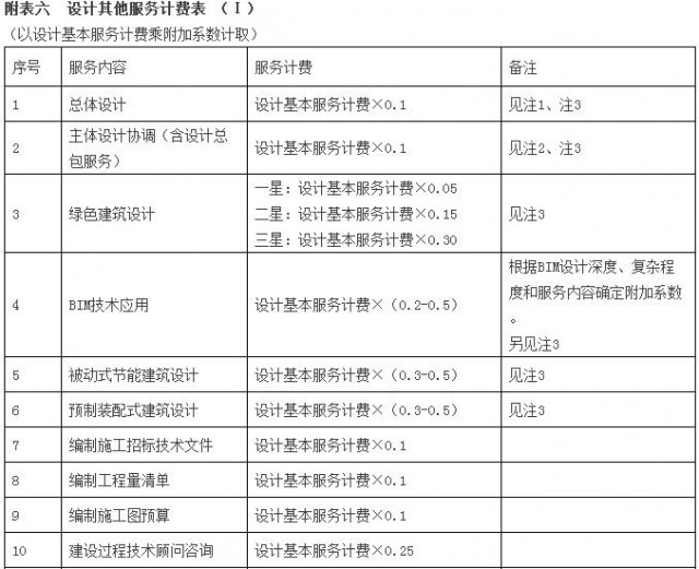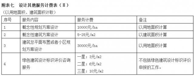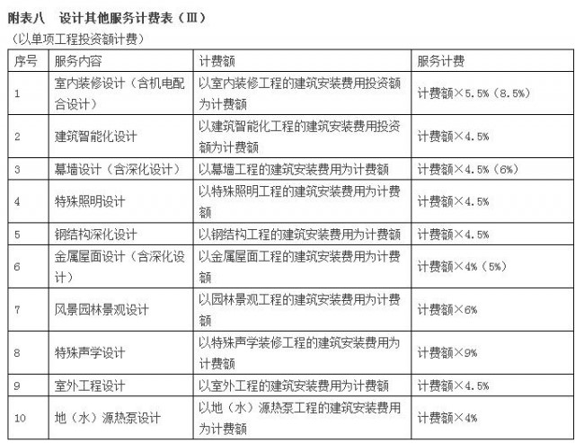 設計其他服務(wù)包括的內容見(jiàn)第一章2.3條款所述,其計費詳見(jiàn)附表六《設計其他服務(wù)計費表(Ⅰ)》、附表七《設計其他服務(wù)計費表(Ⅱ)》及附表八《設計其他服務(wù)計費表(Ⅲ)》。第一章2.3條款未涉及的設計其他服務(wù)內容的計費可比照附表六、七、八執行。