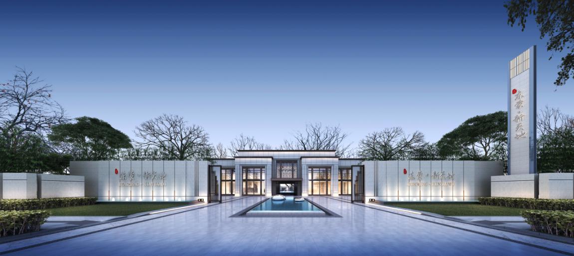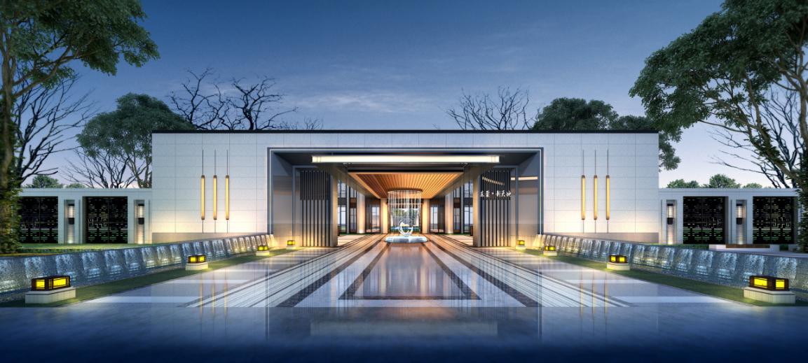 將大門(mén)與小區會(huì )所功能相結合,利用大挑板具有縱向延伸感,增加入口的恢弘氣勢,結合周邊帶有中式元素的景墻,形成一個(gè)有序整體。