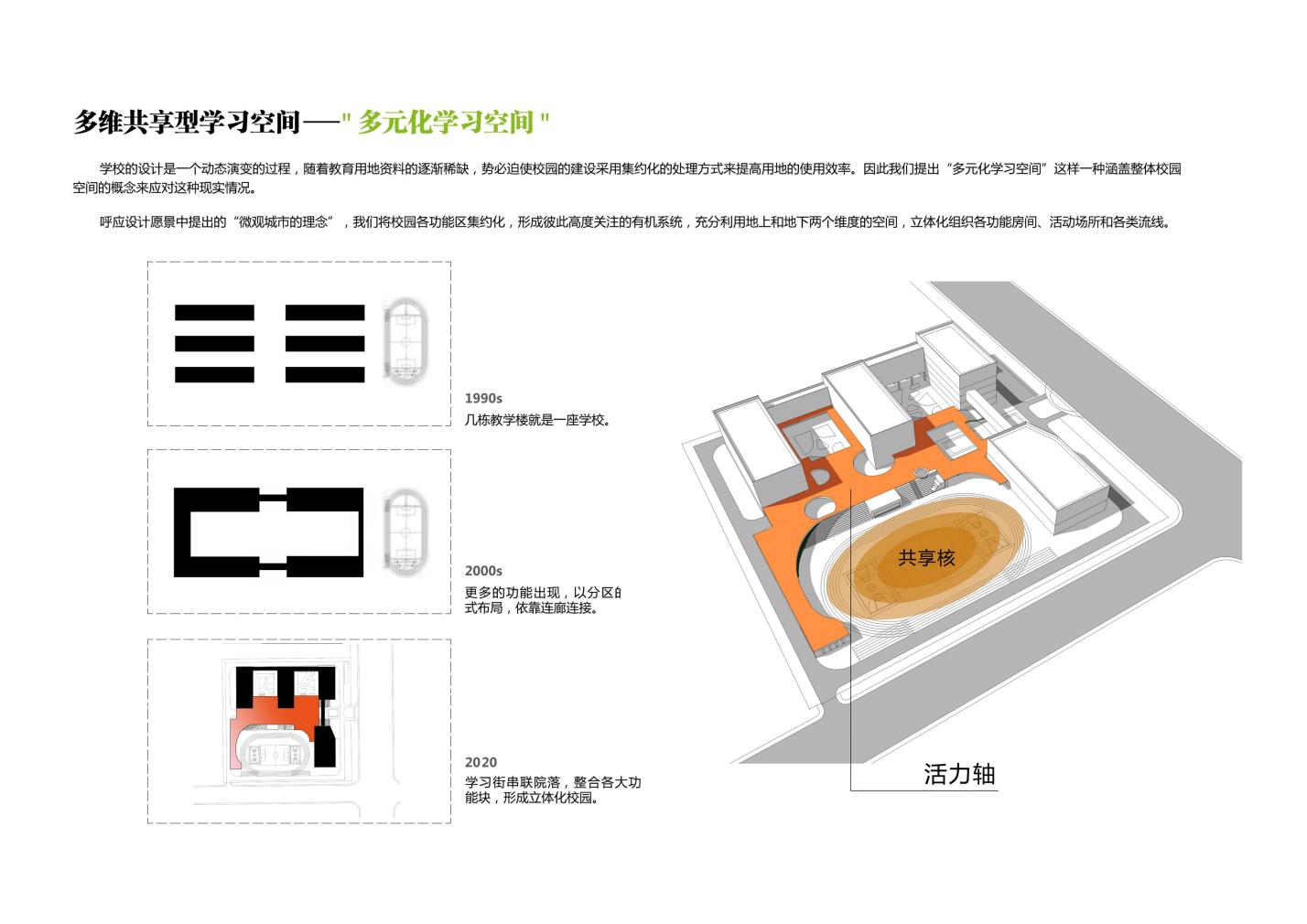 “雙地下”概念是將操場(chǎng)以下的土地進(jìn)行有效利用,將2F綜合樓地下以及操場(chǎng)地下一層作為食堂使用,內部包含廚房以及教職工食堂,建筑面積為5460平方,可容納3000人。將食堂的北側以及西側設置6M以上寬的下沉庭院,解決食堂的采光通風(fēng)問(wèn)題,也結合樓梯踏步與景觀(guān)設計增加學(xué)生的趣味性。第二個(gè)地下就是學(xué)校西側地下一層作為教師的內部停車(chē)庫,可停放200輛車(chē)輛,面積為7500平,操場(chǎng)的地下二層設置地下接送系統,作為家長(cháng)接送孩子的專(zhuān)用停車(chē)庫,可停放160輛車(chē)輛,面積為5200平方,內部設置閘機,家長(cháng)等候區,閱讀區,學(xué)生刷卡出校后家長(cháng)手機會(huì )接收到短信,便捷的接送到孩子。緩解了學(xué)生上下學(xué)學(xué)校附近的交通壓力。