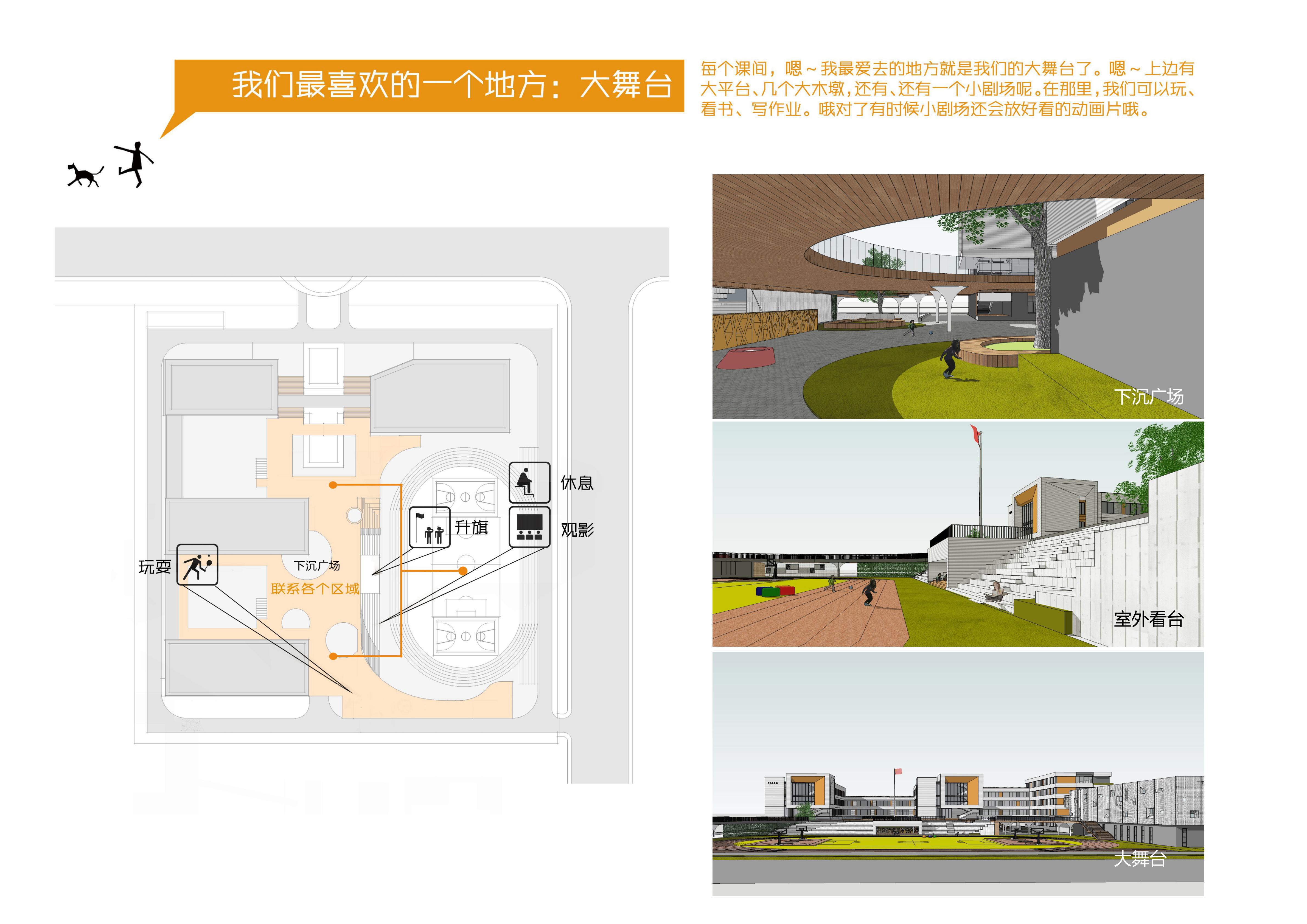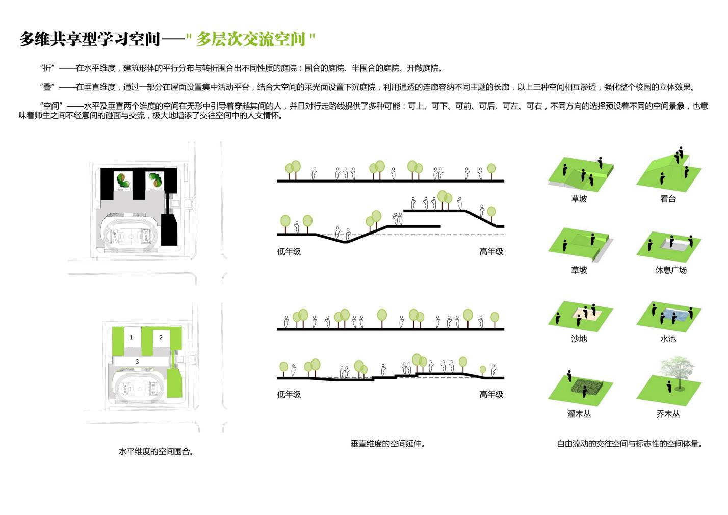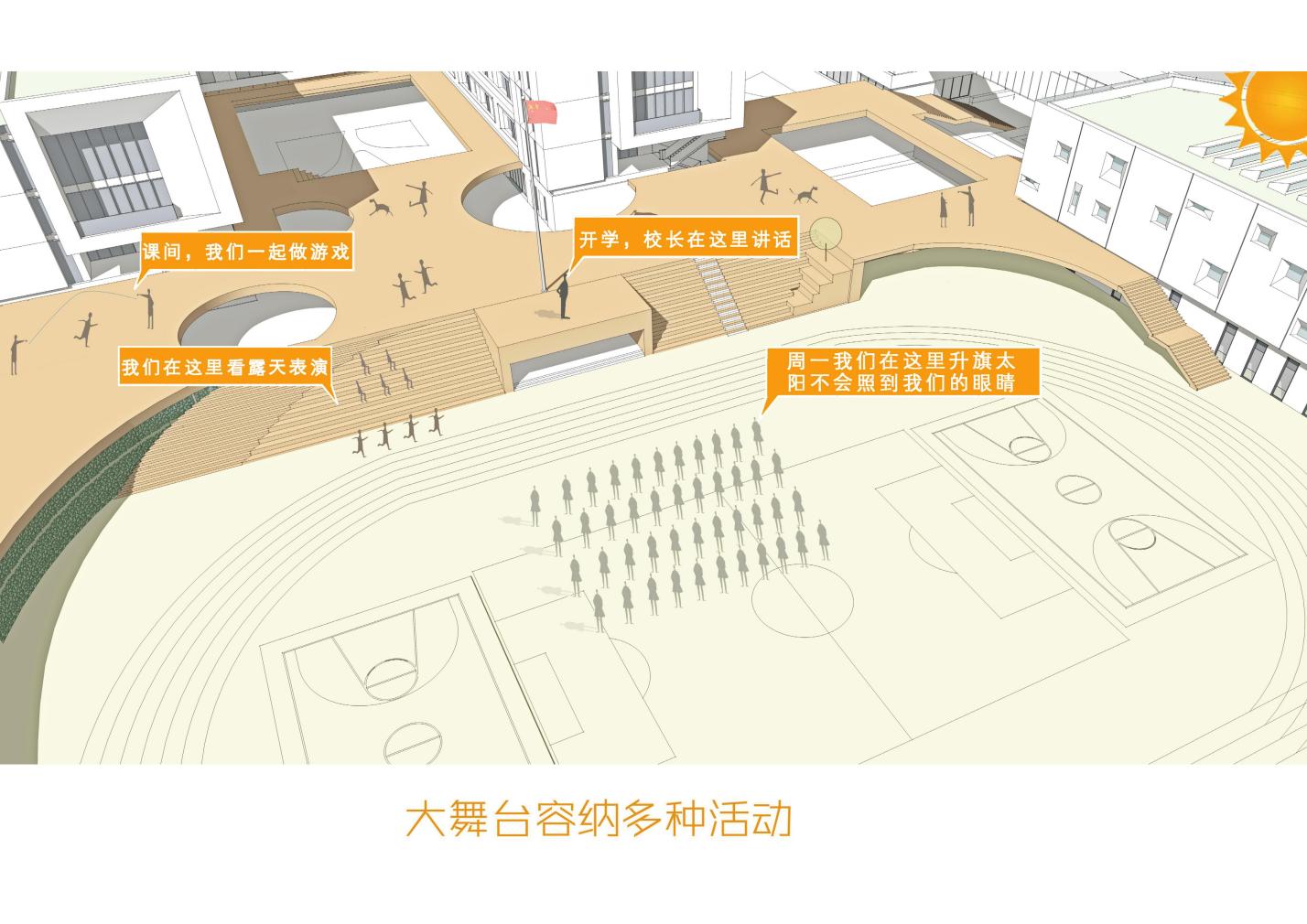 “雙首層”概念是將學(xué)校地上中心部分,局部進(jìn)行一層架空懷抱住操場(chǎng),架空平臺按照一半面積計算為1100平方,平臺上設置多個(gè)采光井,與景觀(guān)設計融為一體,形成學(xué)生的二層活動(dòng)空間,與教師增加更多學(xué)習交流的互動(dòng)空間,平臺下設置了功能房間,一個(gè)400平圖書(shū)閱覽室,2個(gè)音樂(lè )教室,1個(gè)舞蹈教室,一個(gè)體育器材室以及公廁。也形成了學(xué)生的一層活動(dòng)空間,這樣解決了學(xué)生多活動(dòng)場(chǎng)地少的難題,也解決了舞蹈音樂(lè )教室對普通教室教學(xué)引起的噪音污染問(wèn)題。
